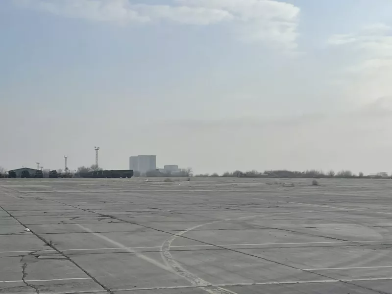 Место взлётной полосы, где когда-то летали самолёты, теперь ограждено забором. Только дорожные разметки напоминают о прошлом.