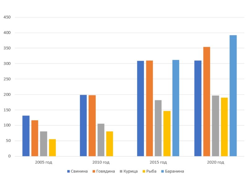 На протяжении 20 лет цены демонстрируют постоянный рост. За этот временной отрезок говядина подорожала на 513 рублей, свинина - на 286 рублей, курица - на 136 рублей, рыба - на 321 рубль. С 2013 года килограмм баранины подорожал на 502 рубля.