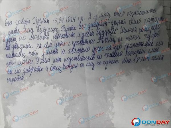 Кроме того, рядом с малышом лежала записка. Там неизвестная 18-летняя девушка сообщает, что она не может содержать мальчика. При этом сама она является сиротой. Незнакомка искала ребенку родителя.