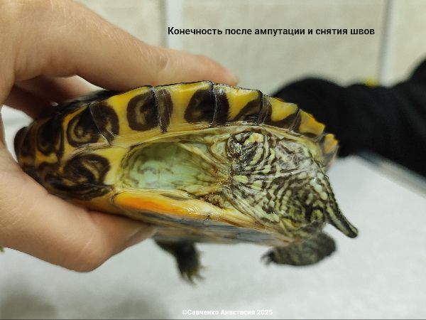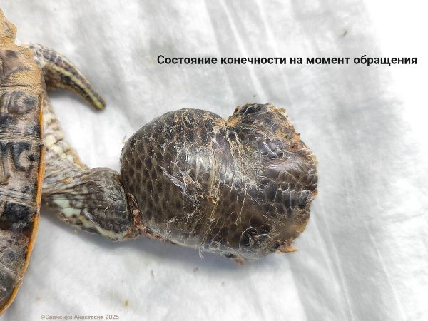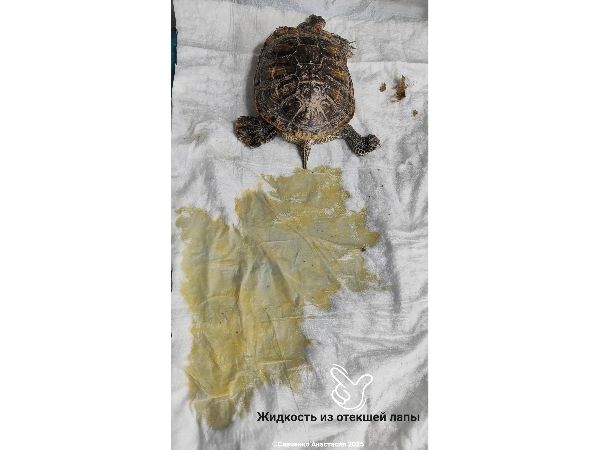 К девушке на прием попала Красноухая черепаха у которой была опухшая лапа. Проблема возникла из-за напольного содержания питомца. Когда-то давно он ползал по полу и на его лапу намотались волосы. Проблему не смогли вовремя заметить и не смыли после прогулки. По итогу конечность черепахи начала отекать.