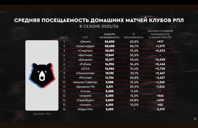 По данным статистики РПЛ, в сезоне 2025/26 средняя посещаемость матчей донской команды составила 11,7%, что на 2,6% ниже, чем в предыдущем сезоне.
